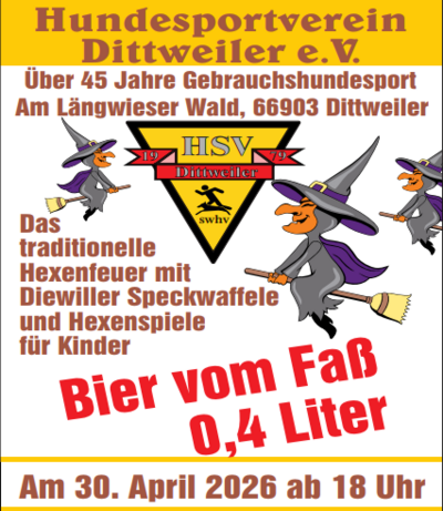 Der Hundesportverein Dittweiler e.V. lädt alle Mitglieder, Freunde und Gönner, am Donnerstag, den 30. April 2026, ab 18 Uhr, zum traditionellen Hexenfeuer auf das Vereinsgelände am Längwieser Wald in Dittweiler ein. Wie in den vergangenen Jahren, wird unser Hexenfeuer von lustigen und spannenden Spiele für Kinder, mit dem verbrennen der Hexe als Höhepunkt, begleitet. Natürlich ist auch für das leibliche Wohl mit Diewiller Speckwaffele, Bratwürste und einem vielfältigen Angebot an Getränken bestens gesorgt.